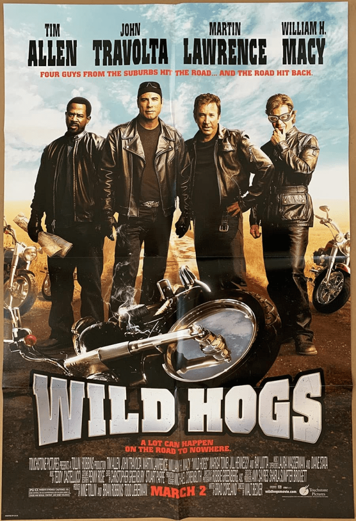Wild Hogs is an American comedy directed by Walt Becker about four middle-aged everymen from the suburbs in the midst of their middle-aged crises, escaping their routine lives on weekends by riding in their motorcycle club, the Wild Hogs. The film stars Tim Allen, John Travolta, Martin Lawrence, and William H. Macy.