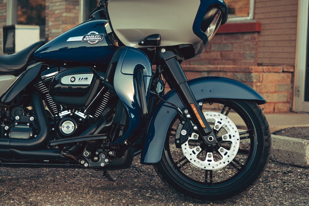 With 2023 comes new colours. Vivid Black returns with both chrome trim and black trim options, and the new Atlas Silver Metallic – replacing Midnight Crimson – comes with a chrome finish. Prospect Gold, a new colour for Harley in 2023, comes with a black finish, replacing last year’s White Sand Pearl option. The new 2-tone colour for 2023 – taking the place of Redline Red/Vivid Black and Reef Blue/Vivid Black – is Bright Billiard Blue/Billiard Gray, available with either chrome trim or black trim.